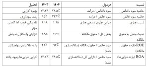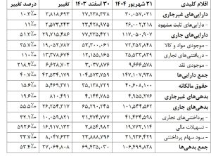 داراییها۴۰.۷٪رشدکرده، ًعمدتا از افزایش موجودی ها ودریافتنیها.بدهی ها نیز افزایش یافته (۵۳.۴٪)،که نشان دهنده وابستگی بیشتر به تسهیالت بانکی است. حقوق مالکانه رشد متوسطی داشته است(۱۵.۶٪.)